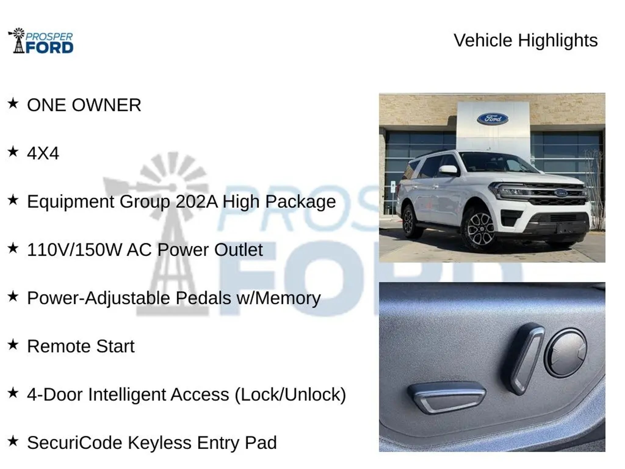 Elevate Your Driving Experience with the Powerful 2024 Ford Expedition XLT Discover the pinnacle of versatility and capability with the 2024 Ford Expedition XLT. This exceptional SUV is the perfect companion for your adventures, offering a commanding presence and a wealth of premium features that cater to your every need. Standout features of this Expedition XLT include: â ONE OWNER â 4X4 â EQUIPMENT GROUP 202A HIGH PACKAGE with Wireless Charging Pad, Power Liftgate, 2nd Row Power-Folding Captain's Chairs, Heated Steering Wheel, Heated/Ventilated Front Seats, and more â Accent Color Painted Rear Bumper â Power-Folding Sideview Mirrors with Autofold â 3rd Row Vinyl Head Restraints â ActiveX-Trimmed 1st & 2nd Row Seats â Ambient Lighting â Remote Start â 4-Door Intelligent Access (Lock/Unlock) â SecuriCode Keyless Entry Pad Powered by the impressive EcoBoost 3.5L V6 GTDi DOHC 24V Twin Turbocharged engine, this Expedition XLT delivers exceptional performance and efficiency, with an EPA-estimated 16 city/22 highway MPG. The 10-speed automatic transmission and 4WD system ensure a smooth, confident ride, no matter the terrain. Step inside and experience the unparalleled comfort and convenience of the Expedition XLT. The spacious, well-appointed cabin features premium materials and thoughtful amenities, including a Wireless Charging Pad, Heated Steering Wheel, and Heated/Ventilated Front Seats. The 2nd Row Power-Folding Captain's Chairs and 3rd Row Vinyl Head Restraints provide versatile seating options to accommodate your passengers and cargo with ease. Safety and technology are also at the forefront of the Expedition XLT. Enjoy the peace of mind of the Advanced Security Pack, the convenience of the 4-Door Intelligent Access, and the connectivity of the SYNC 4 system with Enhanced Voice Recognition. With its striking White exterior and well-equipped interior, this 2024 Ford Expedition XLT is a true standout in its class. Experience the ultimate in capability, comfort, and style â visit our showroom today and let us put you behind the wheel of this exceptional SUV.